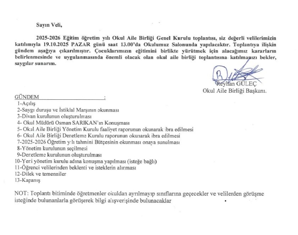 2025-2026 Eğitim Öğretim Yılı Okul Aile Birliği Olağan genel kurul toplantısı 19.10.2025 pazar günü saat 13:00 da yapılacaktır. Tüm velilerimizin toplantıya katılmasını önemle rica ederiz.